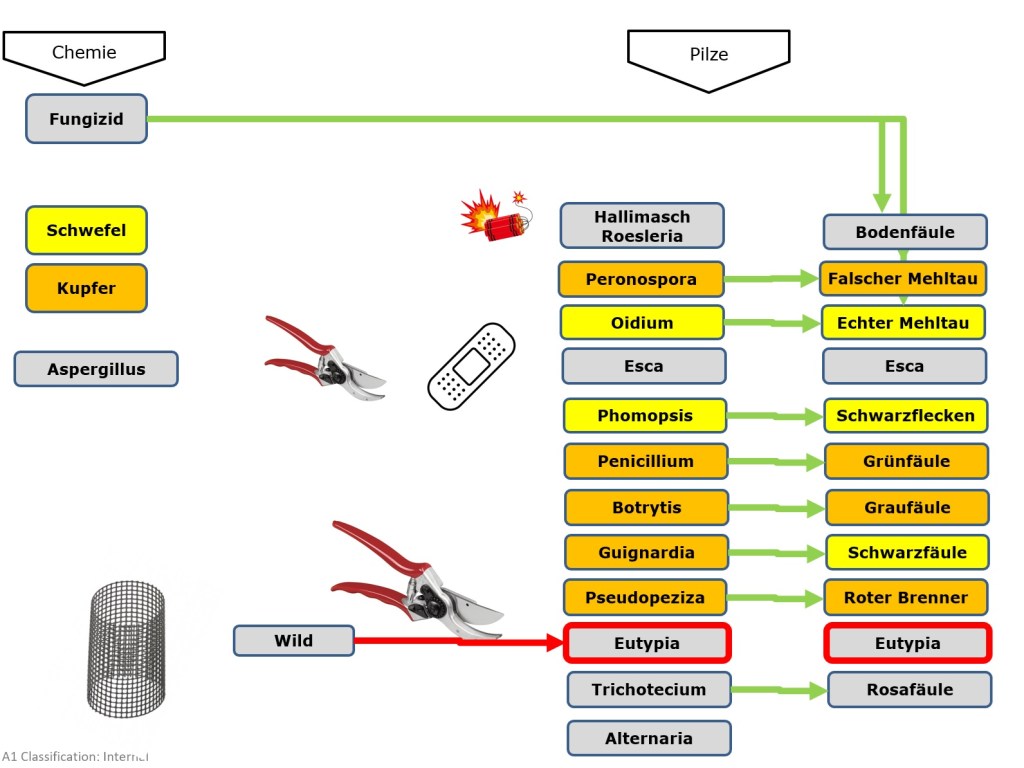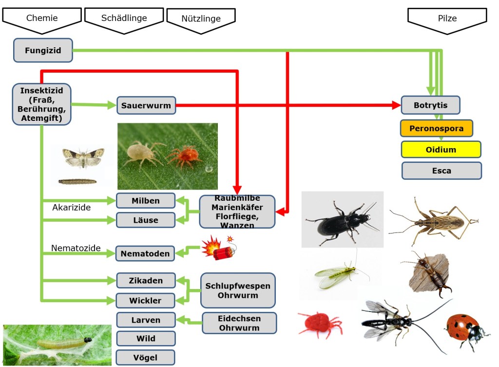 Wie allgemein im Garten so gibt es auch im Weingarte Angreifer und Schutzmaßnahmen gegen sie. Angreifer aus dem Tierreich, Pflanzenreich, der Pilze, von Maschinen und Angriffe des Wetters. Genauso Vielfältig sind die Hygiene und Schutzmaßnahmen dagegen: chemische, physikalische, biologische, biotechnologische und mechanische. Wir schauen sie uns hier einmal genauer an.